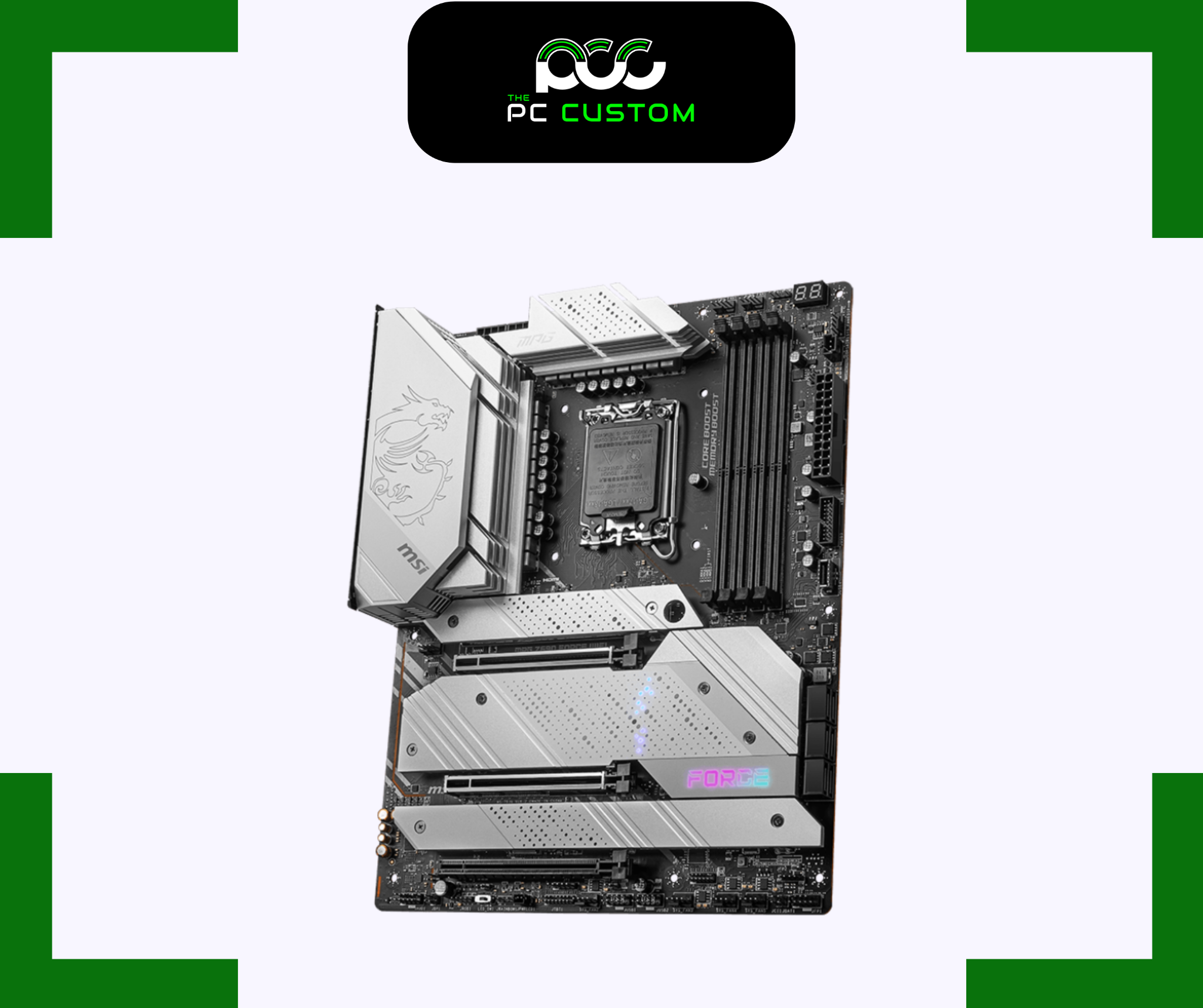 - MSI MPG Z690 FORCE WIFI sở hữu thiết kế ATX & là một trong những bo mạch chủ có thiết kế đẹp nhất trong phân khúc. Nổi bật là các khối heatsink đẹp mắt bao phủ ở các khu vực quan trọng trên bo mạch chủ trên tông màu trắng chủ đạo.